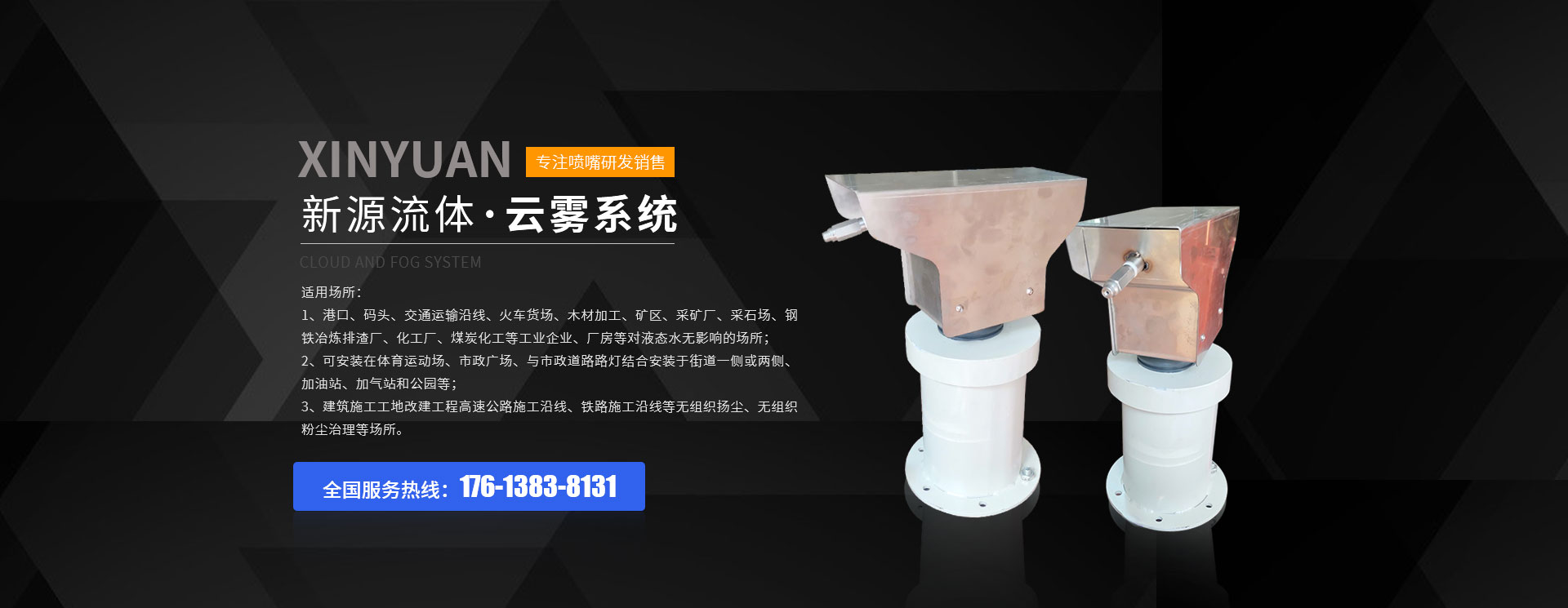 河南新源流體噴霧技術有限公司是一家從事工業噴嘴、噴頭、噴霧噴淋系統、云霧系統,微米級干霧抑塵系統,脫硫系統、環保工程的研發、生產、銷售及服務于一體的技術型企業,產品規格型號多達幾千種,廣泛應用于環保、抑塵、加濕、清洗、冷卻、潤滑、脫硫脫硝、抑菌消毒、噴涂涂層、農林牧業等領域;公司憑借雄厚的研發、創新能力,標準系統的生產流程,完善的品質管理系統和日益完善的銷售網絡及優質的售后服務成為行業的后起之秀。河